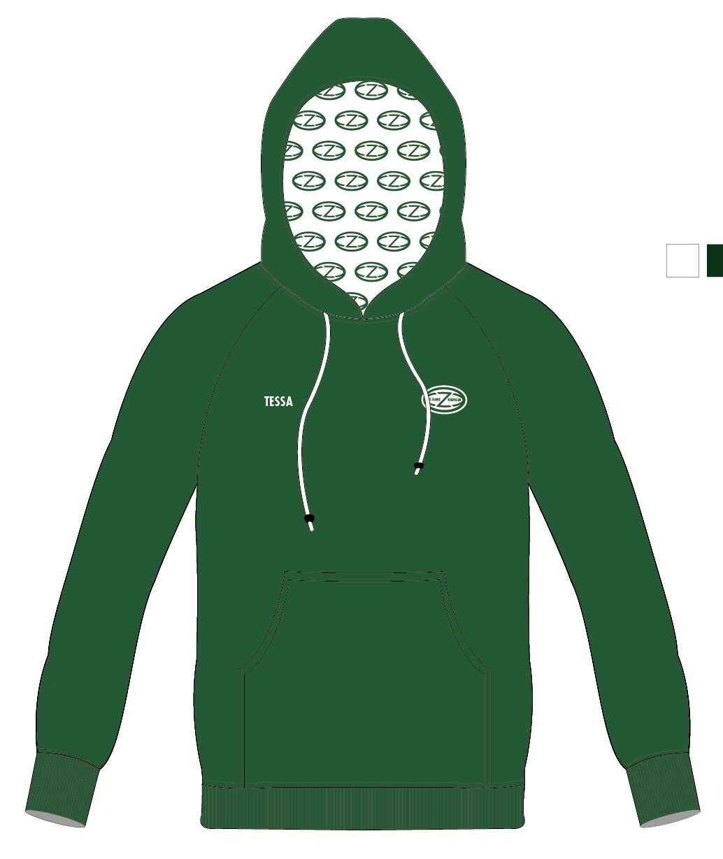 Hoodie of Zoodie (met rits) met kleine logo's in de capuchon.